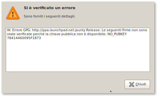 W: Errore GPG: http://ppa.launchpad.net jaunty Release: Le seguenti firme non sono state verificate perché la chiave pubblica non è disponibile: NO_PUBKEY 78414460095F1873